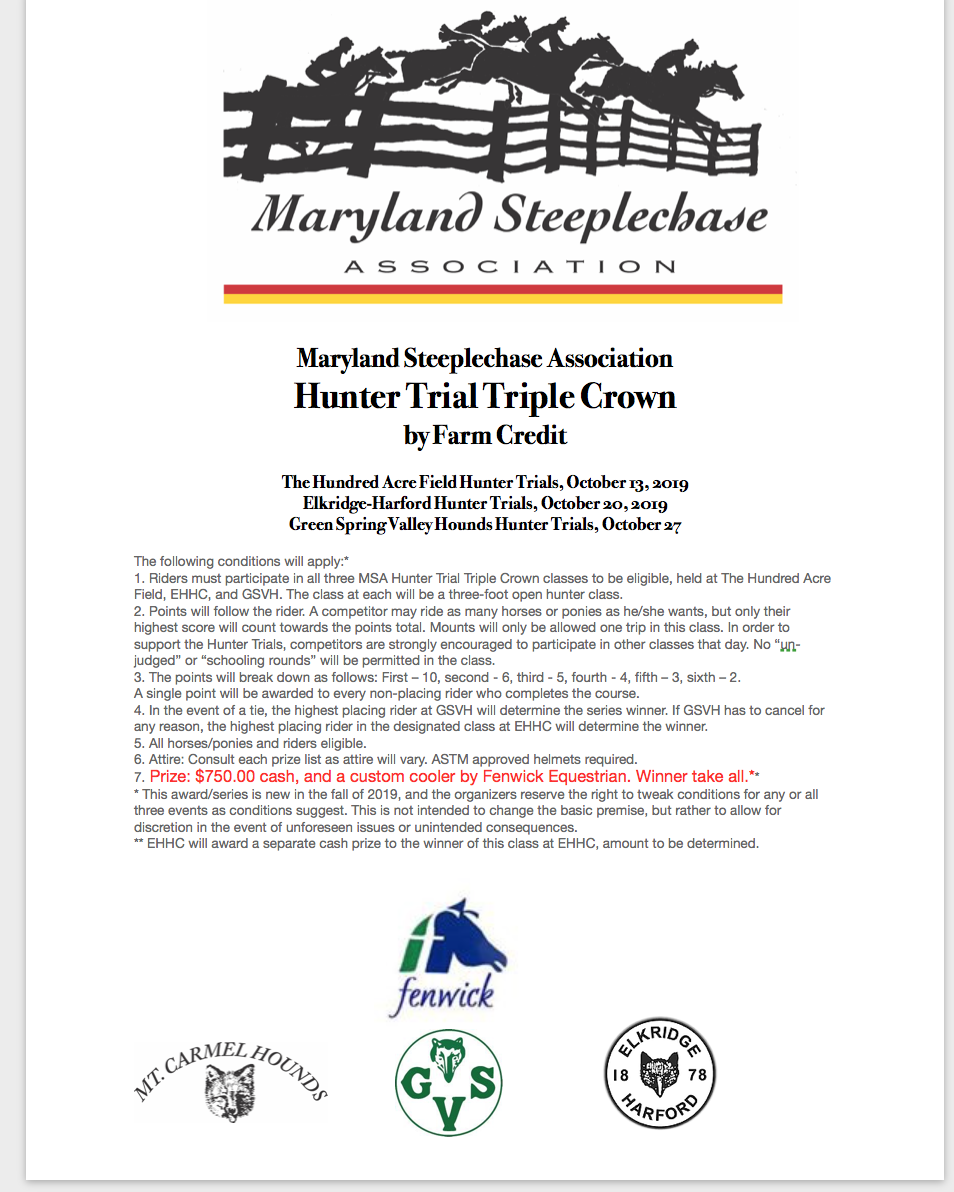 2. The combined scores of these 2 trips will be added to the HAF score to determine the winner of the Maryland Steeplechase Association Hunter Trial Triple Crown series.